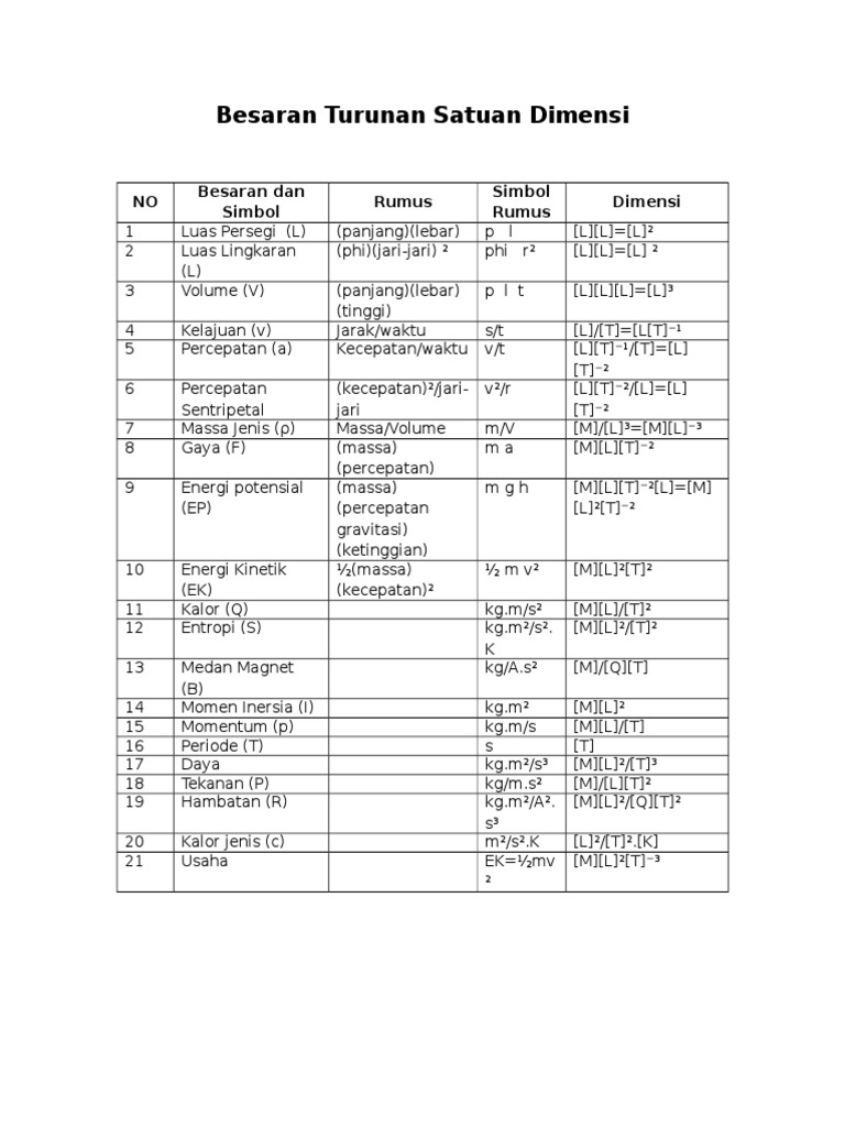 Besaran Turunan Jenis Satuan Dan Dimensinya