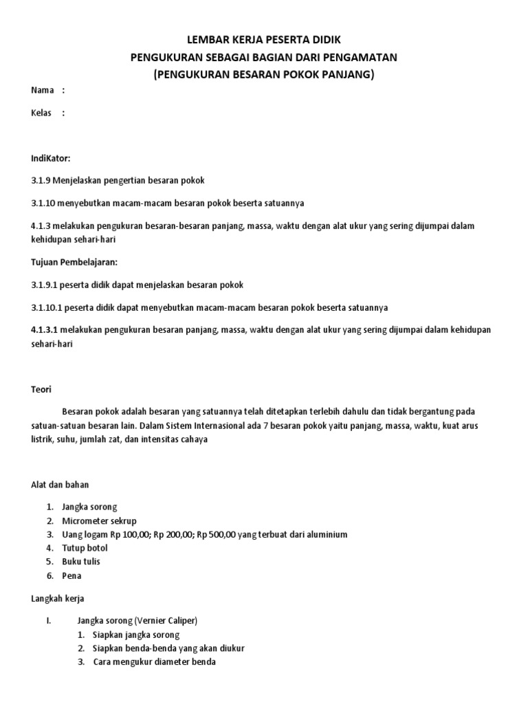 Lembar Kerja Peserta Didik Pengukuran Sebagai Bagian Dari Pengamatan Pengukuran Besaran Pokok Panjang