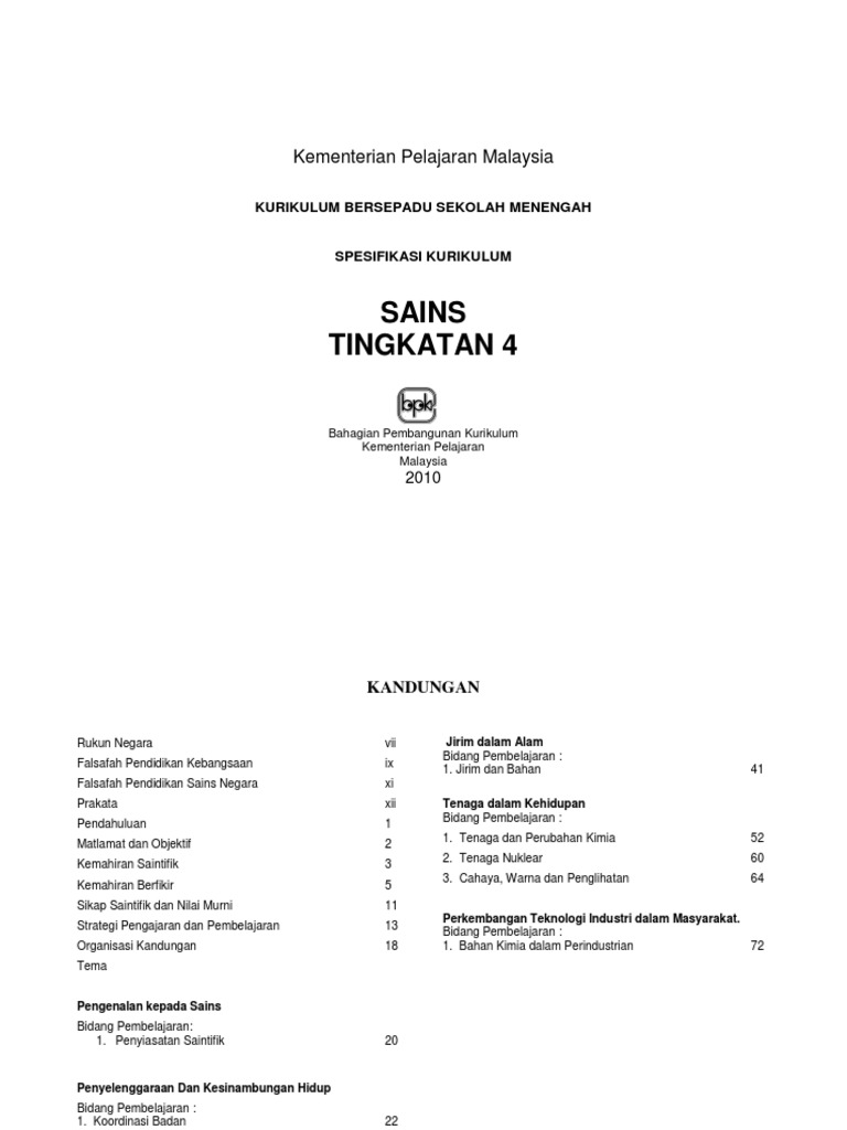 Sains Tingkatan 4 Malaysian Ghost Research 4 Bahagian Pembangunan Kurikulum Kementerian Pelajaran Malaysia 2010 Vi Kandungan Rukun Negara Jirim Dalam Vii Kimia Biologi Dan Pdf Document