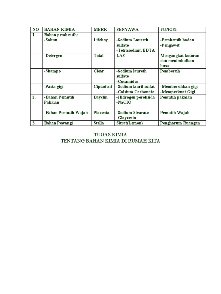 Bahan kimia yang ada di rumah zat zat yang ada dalam kehidupan kita sehari hari kebanyakan tidak dalam keadaan murni melainkan bercampur dengan dua atau lebih zat lainnya. Tidak hanya itu produk ini ramah lingkungan dan aman digunakan untuk berbagai tugas rumah tangga sehingga merupakan salah satu bahan wajib dalam sebagian besar produk pembersih rumah.