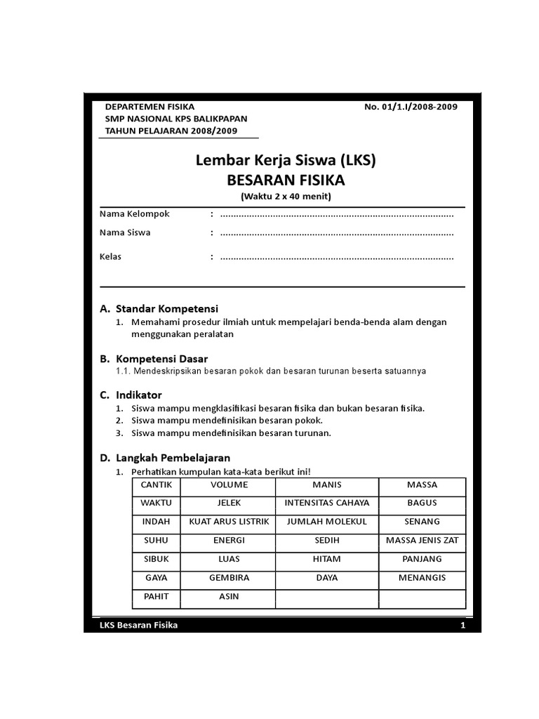 Pdf Lks Besaran Fisika 1cantik Volume Manis Massa Waktu Jelek Intensitas Cahaya Bagus Indah Kuat Arus Listrik Jumlah Molekul Senang Suhu Energi Sedih Massa Jenis Zat Sibuk Luas Hitam Panjang Gaya Gembira