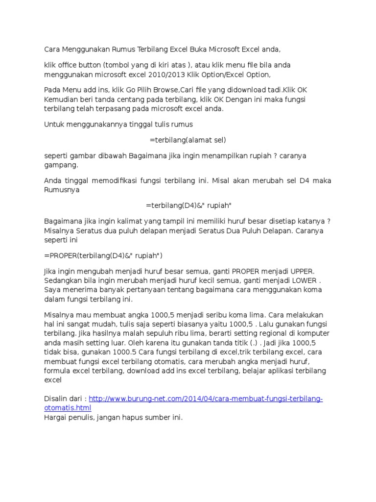 Memang dapat kita rubah dengan cara manual tapi jika jumlahnya banyak itu memakan waktu yang lama. Rumus terbilang di ms. Excel baik yang 1997 2010 atau 2013 tidak menyediakan fitur terbilang.