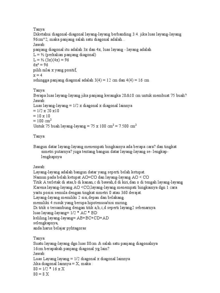 Kerangka Layang Layang Tersebut Memiliki Panjang Diagonal 15 Cm Dan 10 Kali Panjang Sisi Yang Pdf Document