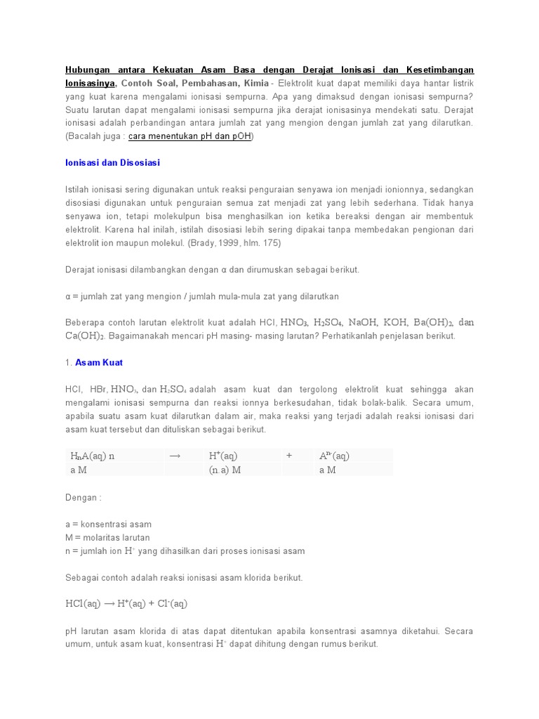 Nilai Derajat Ionisasi Larutan Elektrolit Kuat Yang Terionisadi Sempurna Brainly Co Id