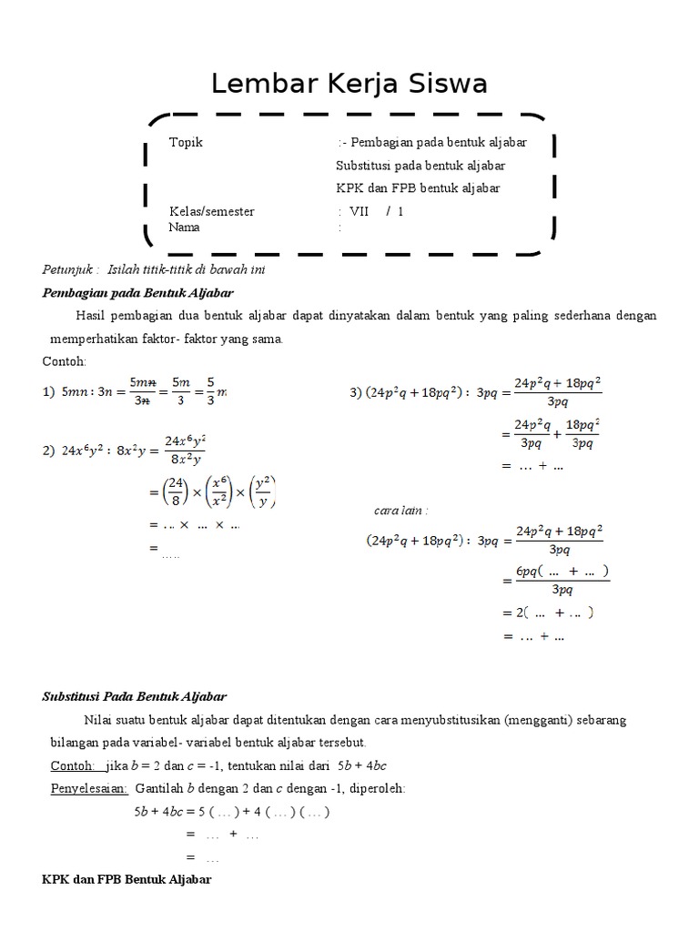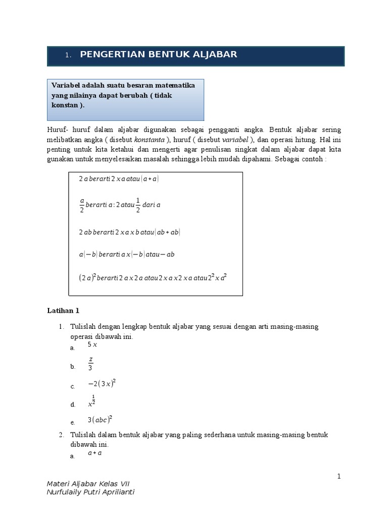 Doc Materi Aljabar Kelas Vii Pertemuan Kedua Smp Matematika Academia Edu