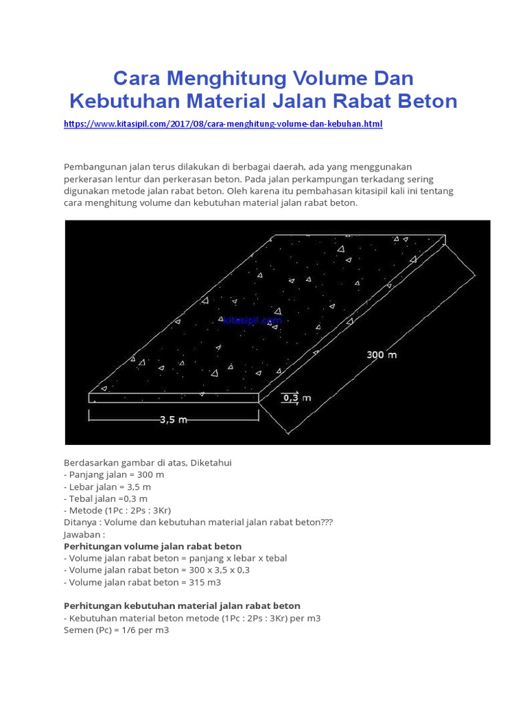 Cara menghitung kebutuhan m3 beton untuk cor jalan raya. Doc cara menghitung konversi m3 ke ton mohammad ismail academiaedu melengkapi jawaban jupri s merubah dari volume m3 menjadi masa ton harus dicari masa jenisnya dulu contoh beras masa jenis beras anggap r 08 tonm3 jadi v x r m 1 m3 x 08 tonm3 08 ton karena ukuran masa diambil dari masa air. Ahadi 27 july 2017 beton 19 comments.