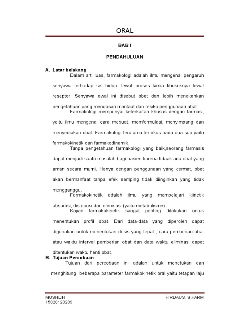 1 Laporan Oral Syarifah Zahra Al Mahdaly Docx Oral Bab I Pendahuluan A Latar Belakang Farmakokinetika Dapat Didefenisikan Sebagai Setiap Proses Yang Course Hero