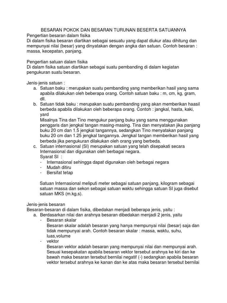 Satuan merupakan salah satu komponen besaran yang menjadi standar dari. Sedangkan satuan untuk besaran turunan di atas adalah seperti pada tabel berikut. Selain besaran pokok dan turunan besaran fisika masih dapat dibagi atas dua kelompok lain yaitu besaran skalar dan besaran vektor.