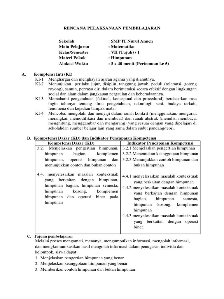 Rpp Matematika Smp Materi Himpunan Kelas 7 Smp Kurikulum 2013 Judul Situs