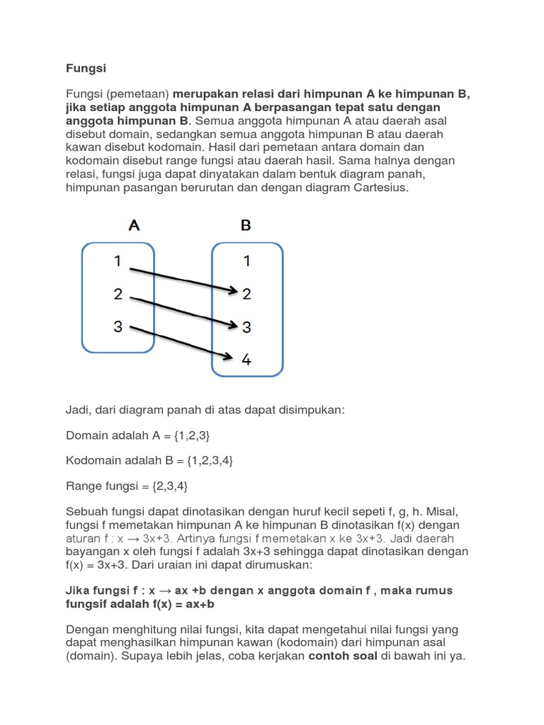 Jadi dari diagram panah di atas dapat disimpulkan bahwa. Domain d f adalah a 123 kodomain adalah b 1234 range hasil r f adalah 234 grafik fungsi. Relasi merupakan sebuah aturan yang memasangkan anggota himpunan satu ke himpunan yang lain.