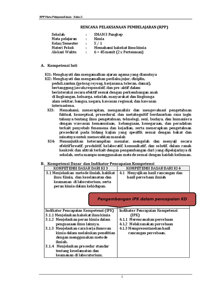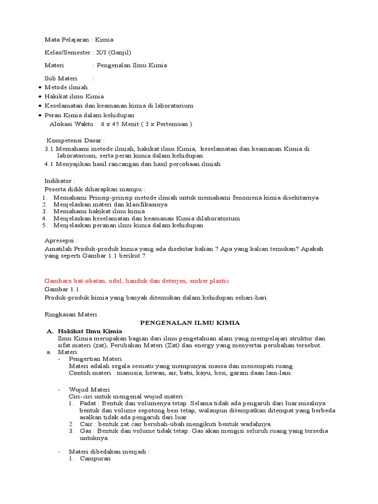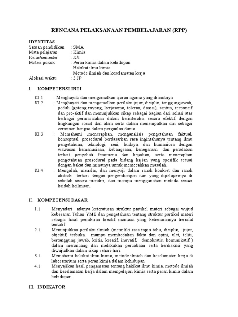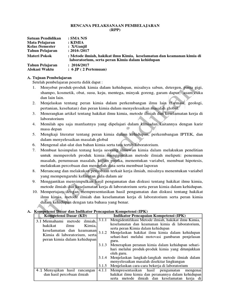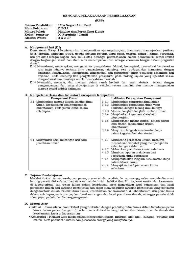 Rencana Pelaksanaan Pembelajaran Nama Sekolah Ma Al Jawami Mata Pelajaran Kimia Kelas Semester X I Ganjil Materi Pokok Hakikat Dan Peran Kimia Dalam Kehidupan Serta Metode Ilmiah Alokasi Waktu