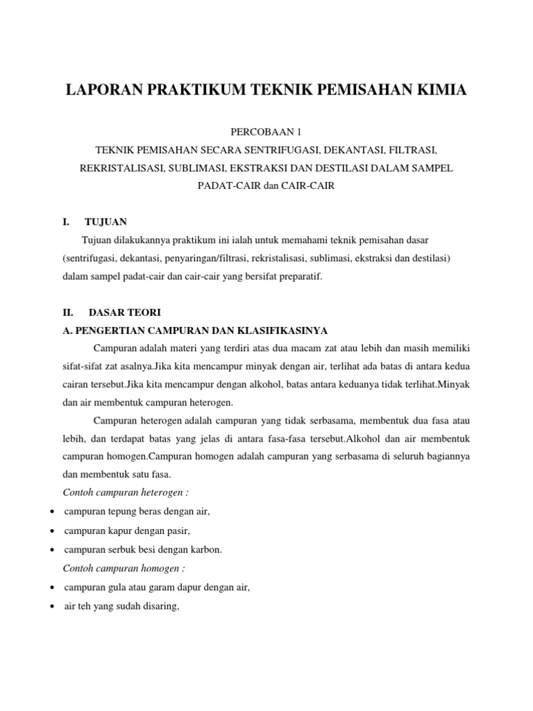 Doc Teknik Pemisahan Secara Sentrifugasi Dekantasi Filtrasi Rekristalisasi Dan Destilasi Dalam Sampel Padat Cair Dan Cair Cair Nuroida Ulfa Academia Edu