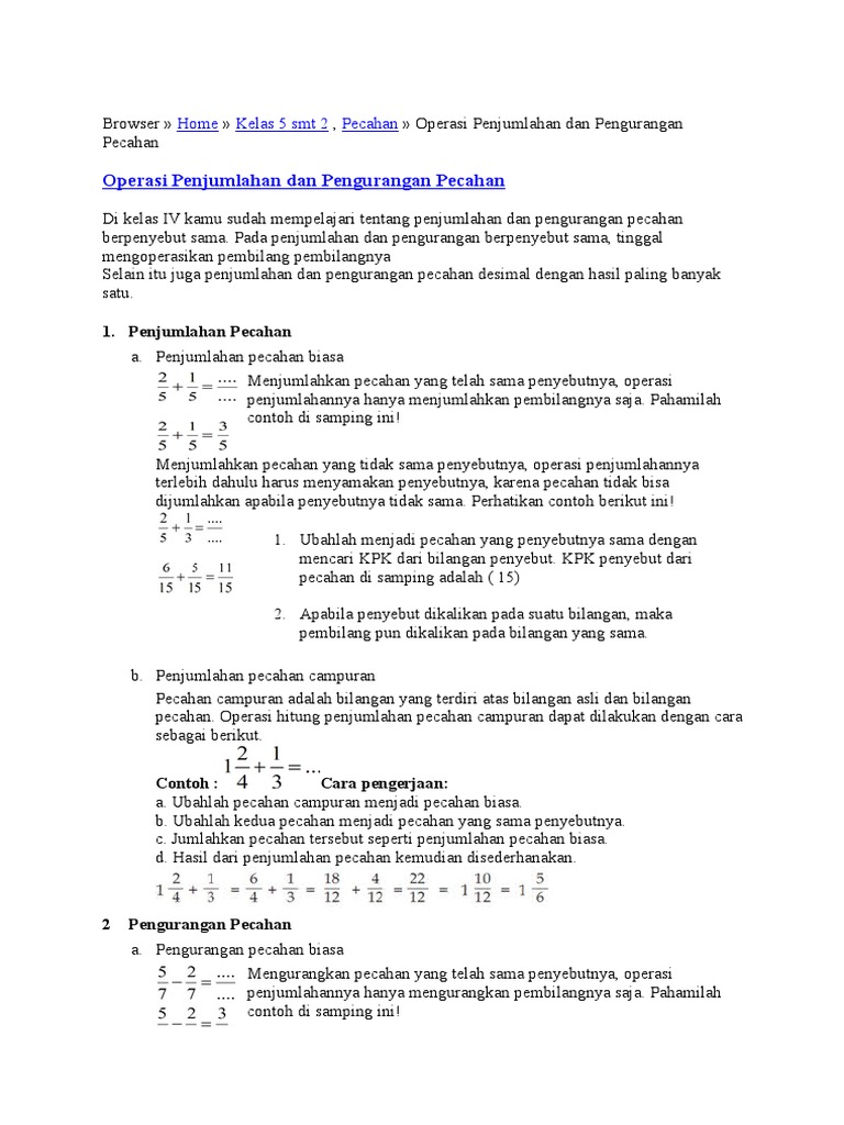 Operasi Penjumlahan Dan Pengurangan Pada Pecahan Biasa Dan Pecahan Campuran Berpendidikan Com
