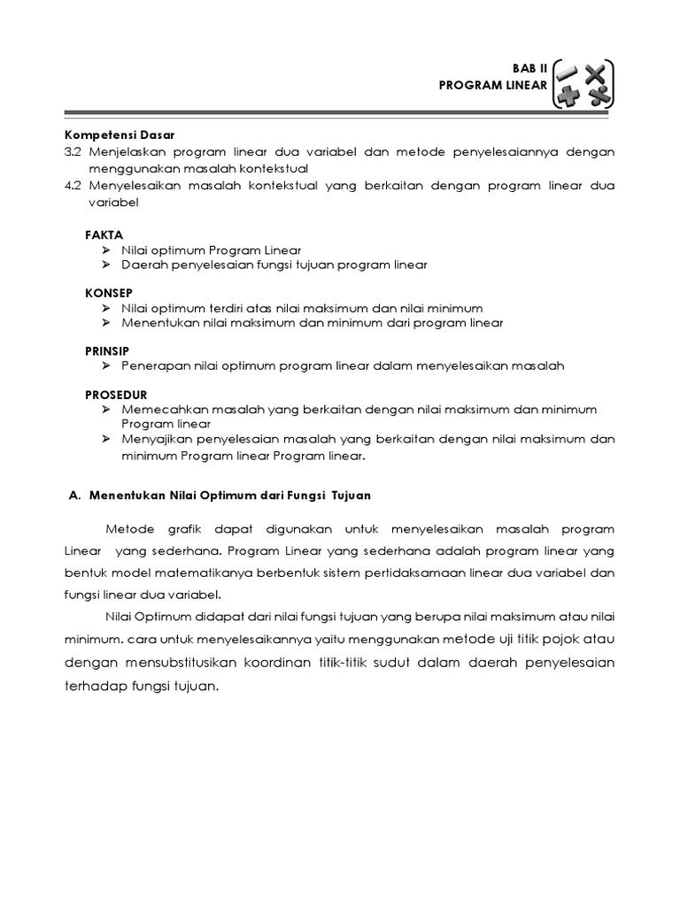 Program Linear Menentukan Nilai Optimum Suatu Fungsi Objektif Dengan Menggunakan Metode Uji Titik Pojok Pendidikan Matematika