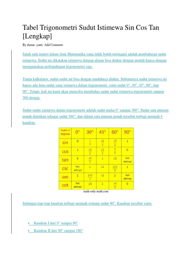 Tabel Sudut Istimewa Sin Cos Tan Cot Sec Cosec 0 Sampai 360 Trigonometri