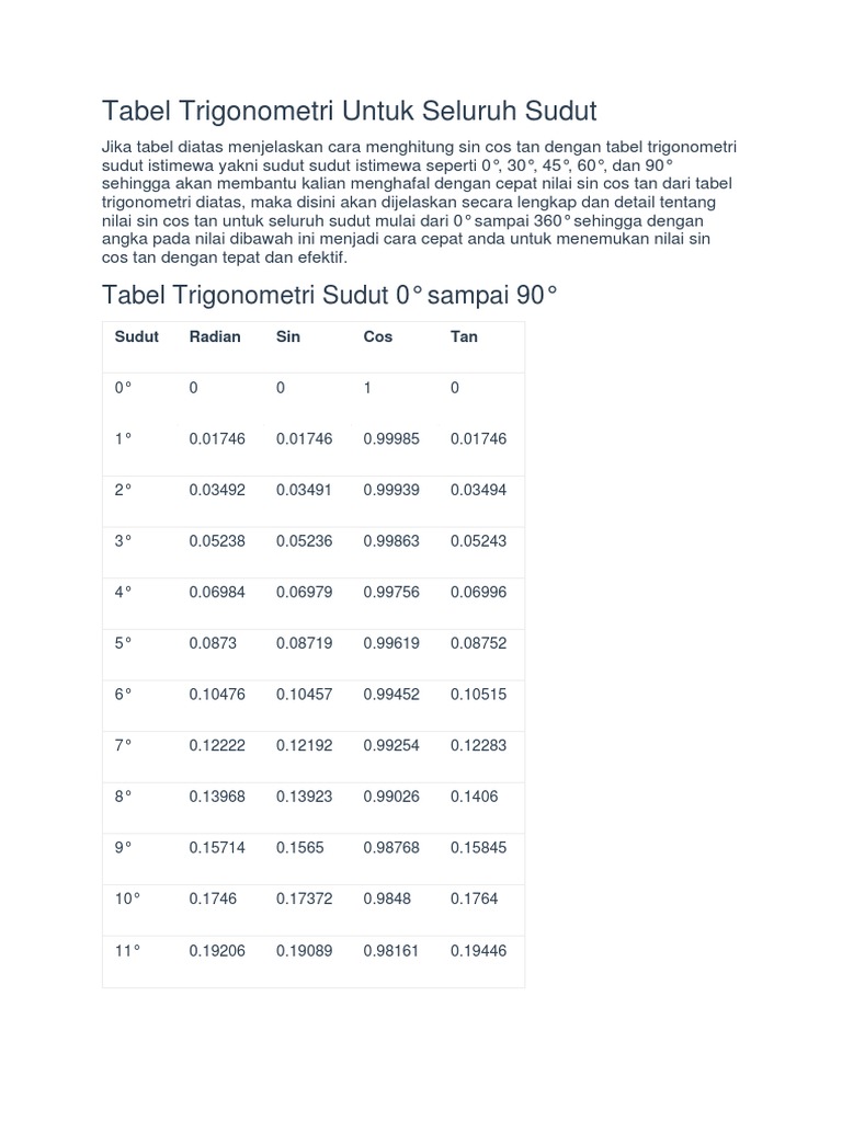 Tabel Sin Cos Tan Dari 0 Sampai 360 Derajat Terlengkap Brainly Co Id