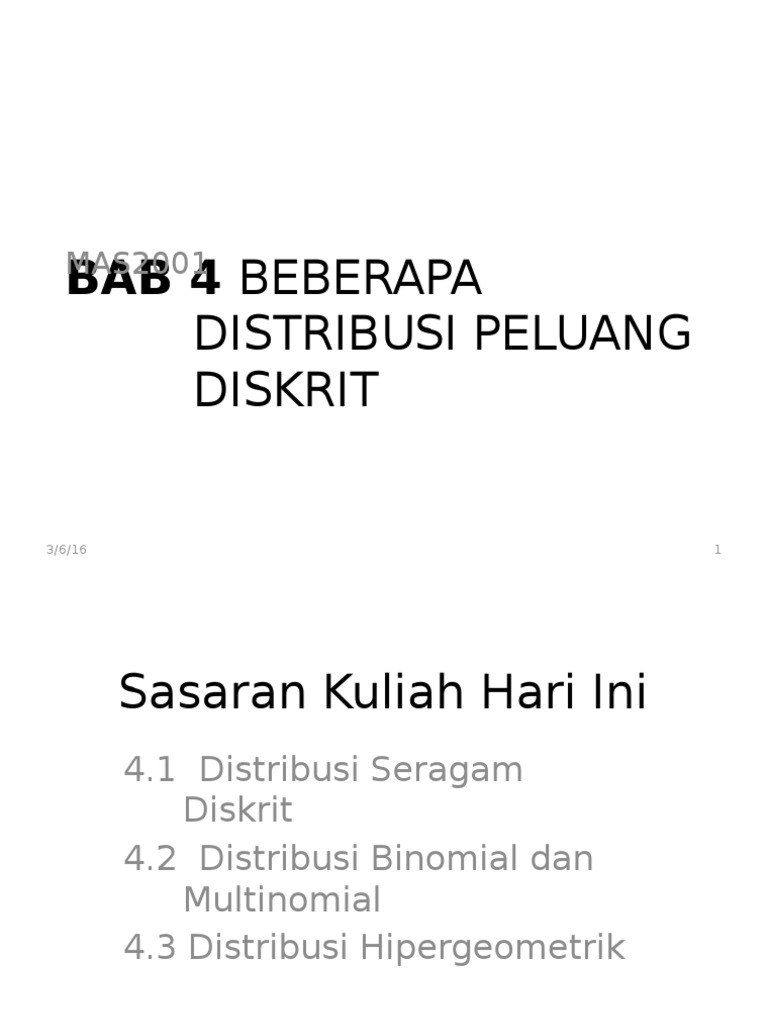 302585025 Beberapa Distribusi Peluang Diskrit 1 Docx Mas2001 Bab 4 Beberapa Distribusi Peluang Diskrit Sasaran Kuliah Hari Ini 4 1 Distribusi Seragam Course Hero