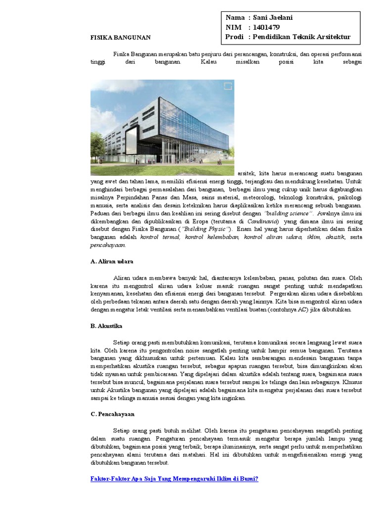 Fisika bangunan arsitektur. Fisika bangunan merupakan kumpulan ilmu pengetahuan yang digunakan untuk menganalisa dan berfokus untuk mengendalikan fenomena fisika yang memiliki pengaruh pada bangunan dan rancangan arsitektur. Penghawaan alami buatan g. Konsep konsep fisika bangunan b.