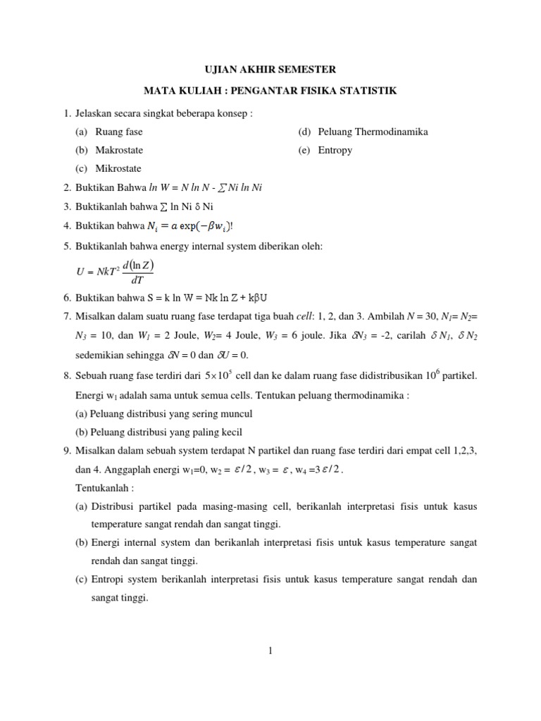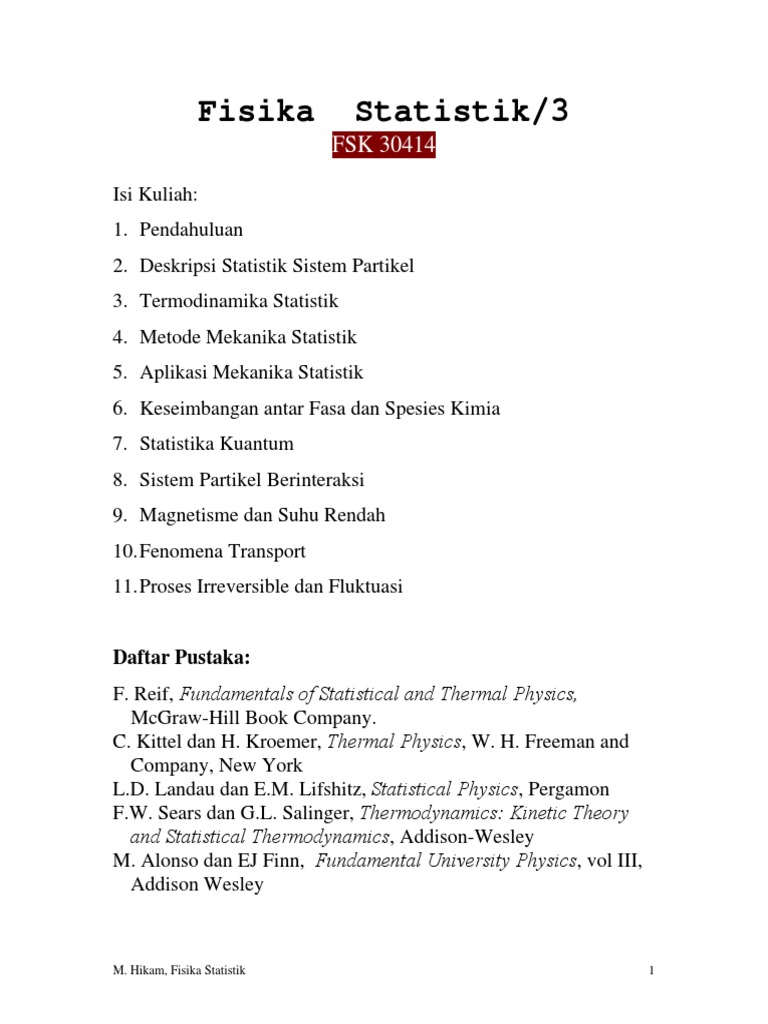 Utari s suhendi e 2004 diktat kuliah fisika statistik minggu ke kompetensi dasar indikator materi pokok sub materi pokok pengalaman belajar media evaluasi sumber. Fisika statistik merupakan suatu bidang ilmu yang mempelajari suatu sistem makroskopik dengan menggunakan model model m ikros kopik. Diktat fisika statistik mikrajuddin abdullah 1.