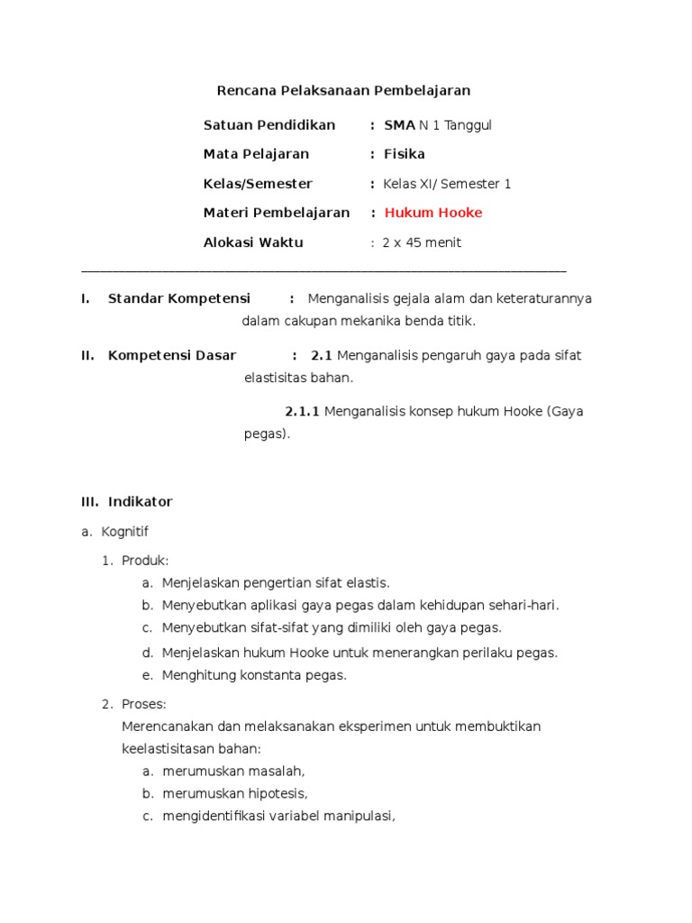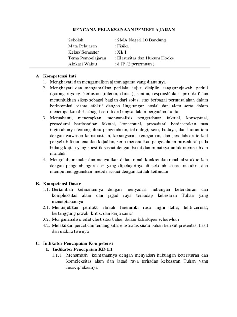 Lampiran 1 Rencana Pelaksanaan Pembelajaran Rpp Elastisitas Dan Hukum Hooke Pdf Free Download