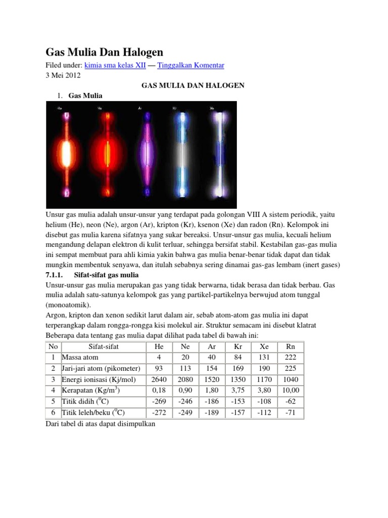 Gas Mulia Halogen Pptx Sifat Sifat Gas Mulia Tidak Berwarna Tidak Berbau Tidak Berasa Molekul Molekulnya Terdiri Atas Satu Atom Monoatom Argon Course Hero