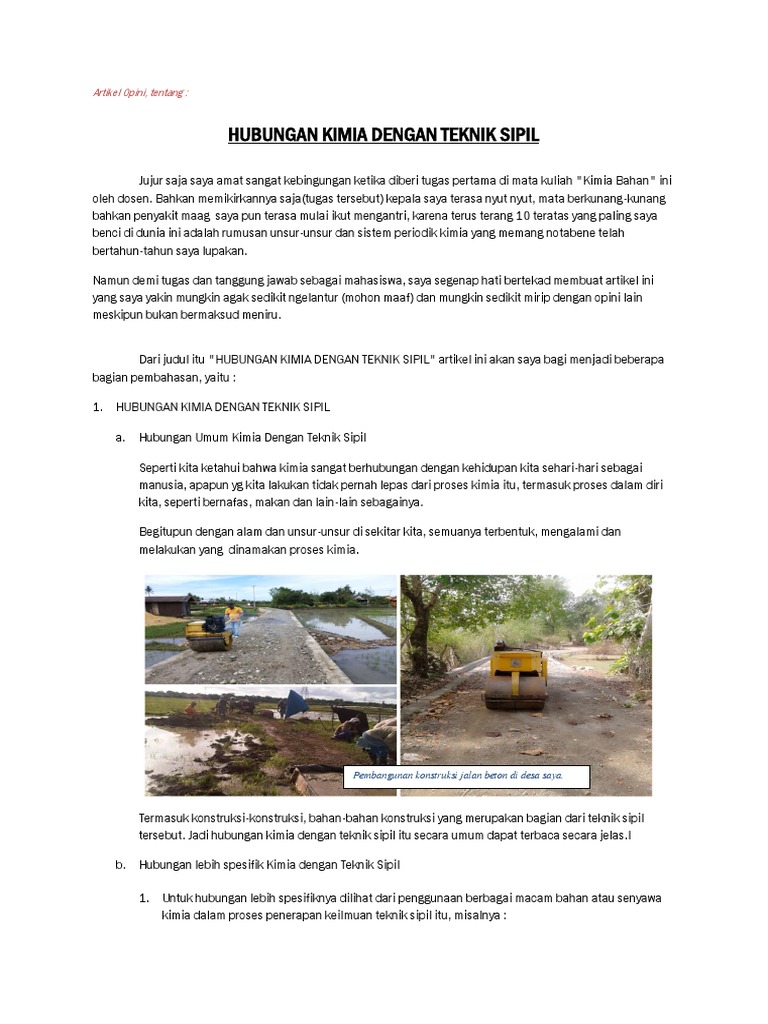 Hubungan kimia dengan teknik sipil. Teknik sipil mempunyai ruang lingkup yang luas di dalamnya pengetahuan matematika fisika kimia biologi geologi lingkungan hingga komputer mempunyai peranannya masing masing. Selama saya kuiliah di jurusan teknik sipil dulu saya belum pernah bertemu satu mata kuliah pun yang membahas masalah fisika listrik optik teori atom relativitas. Bahan bahan yang digunakan dalam bidang ini adalah semen kayu cat paku besi paralon pipa pvc lem dan sebagainya.