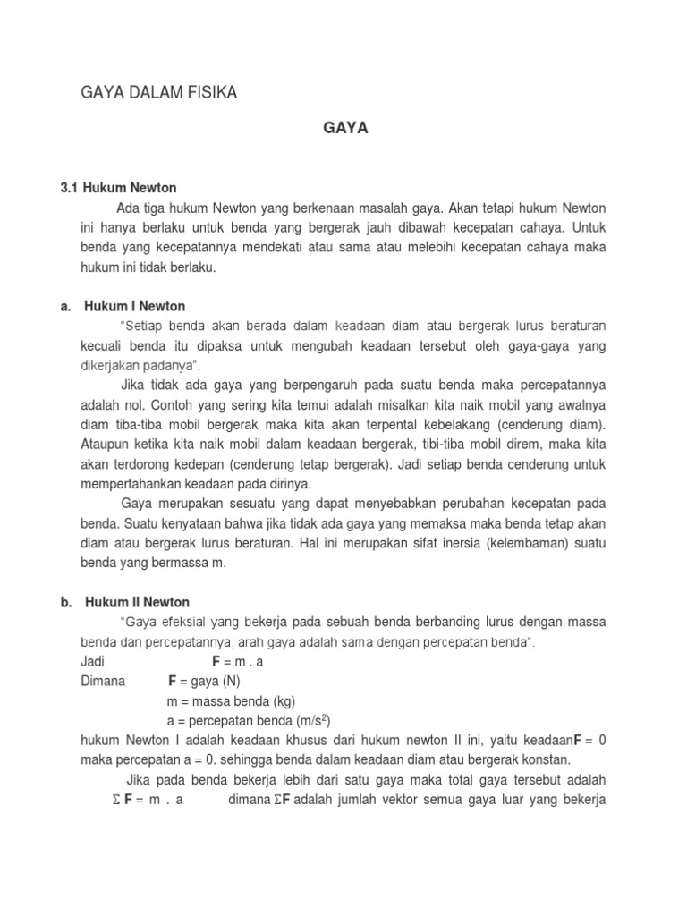 Setiap benda akan tetap diam atau bergerak lurus beraturan apabila pada benda itu tidak bekerja gaya. Dari hasil pengamatan dan eksperimennyanewton merumuskan tiga hukum mengenai gaya dan gerakyang dikenal dengan hukum i newton hukum ii newton danhukum iii newton. Terkadang persamaan itu membentuk suatu persamaan atau hubungan misalnya hukum ii newton.