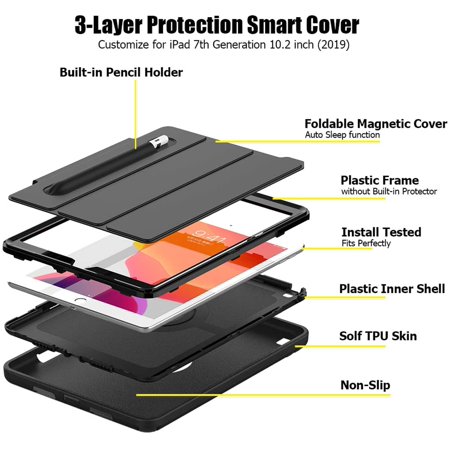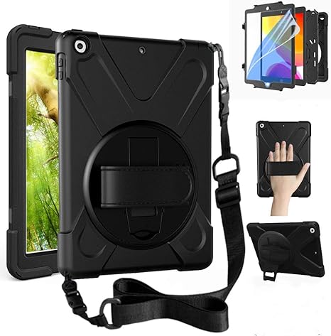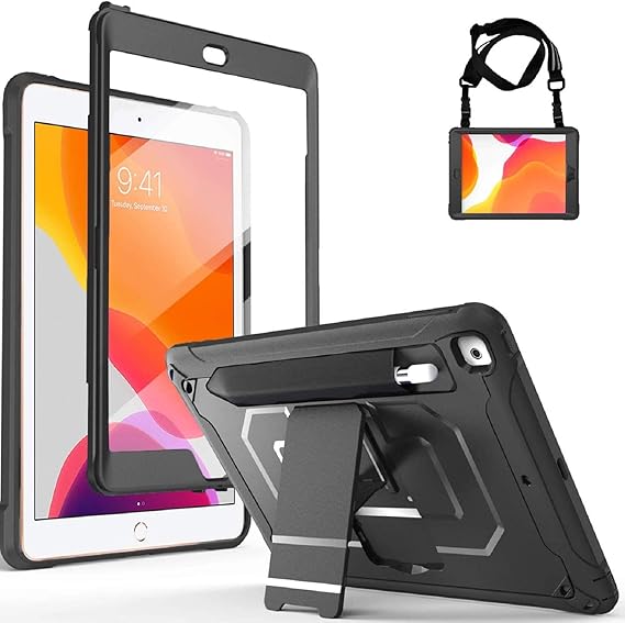 Amazon Com Caszone Ipad 10 2 Case 2020 Ipad 8th Gen 2019 7th Generation Case Built In Screen Protector Full Body Heavy Duty Shockproof Rugged Protective Cover With 360 Stand Hand Strap Shoulder Straps Black Computers