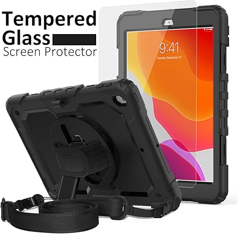 Amazon Com Ipad 8th 7th Generation Case Ipad 10 2 Case 2020 2019 Kid Proof Ambison Full Body Protective Case With 9h Tempered Glass Screen Protector 360 Rotatable Kickstand Hand Strap Black Computers Accessories