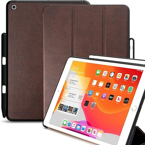 Amazon Com Dtto New Ipad 7th 8th Generation Case 10 2 Inch 2019 2020 Premium Leather Business Folio Stand Cover With Built In Apple Pencil Holder Auto Wake Sleep And Multiple Viewing Angles Brown Computers