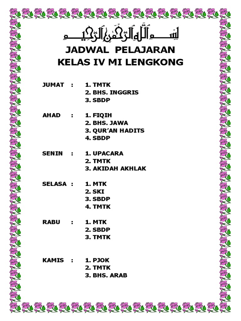Jadwal Pelajaran Kelas Iv Sa Ad Bin Abi Waqos Tahun Pelajaran 2017 2018 Mi Darul Ulum Wates
