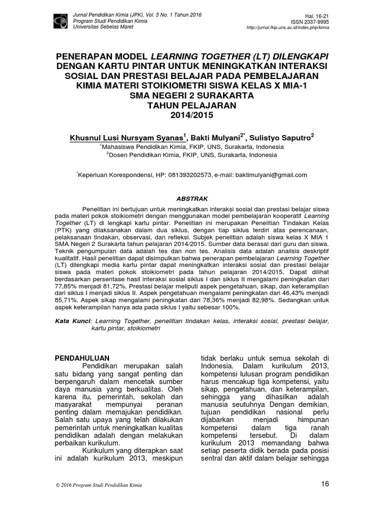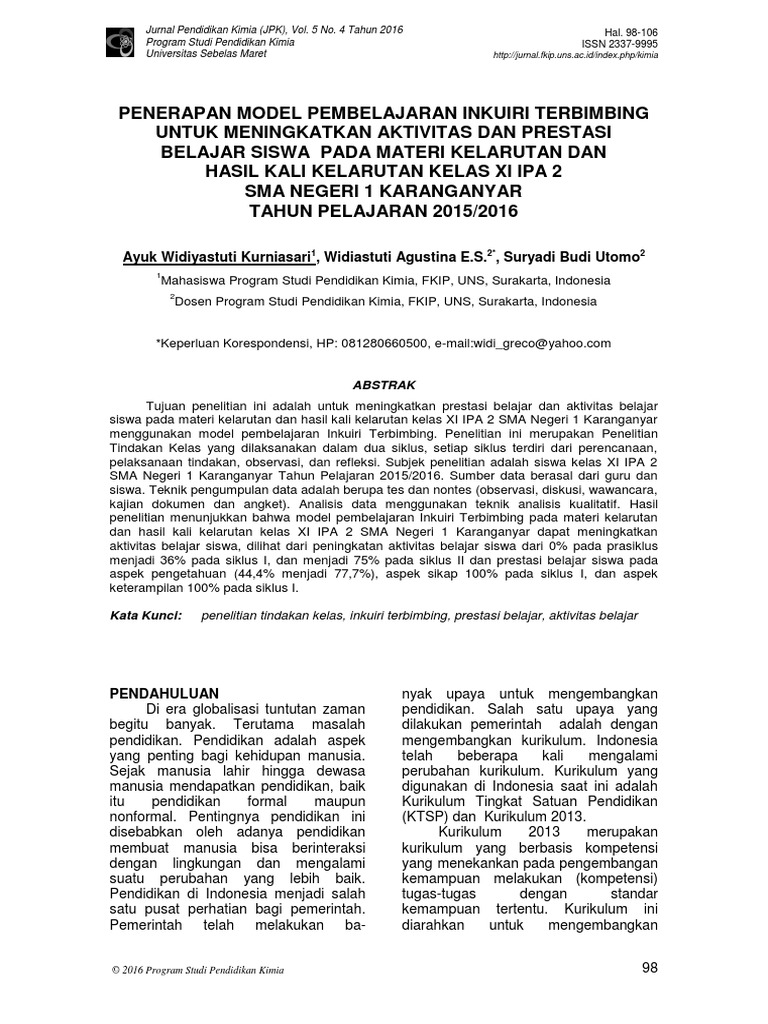 1411 2531 is a peer reviewed scientific journal that published twice a year on june an decemberthe journal published by faculty of teacher training and education university of lampung in collaboration with himpunan evaluasi pendidikan indonesia provinsi lampungscope of the interest are the articles in the field of. The jkpk jurnal kimia dan pendidikan kimia is a rank 2 accredited scientific journal based on the decree of the director general of research and development strengthening of the ministry of research technology and higher education of the republic of indonesia no. Prodi magister pendidikan kimia pascasarjana uns memiliki enam belas 16 orang dosen berkualifikasi doktor di bidang pendidikan kimia pendidikan ipa dan kimia murni baik lulusan dalam negeri maupun luar negeri bahkan enam di antara dosen tersebut memiliki jabatan guru besar profesor.