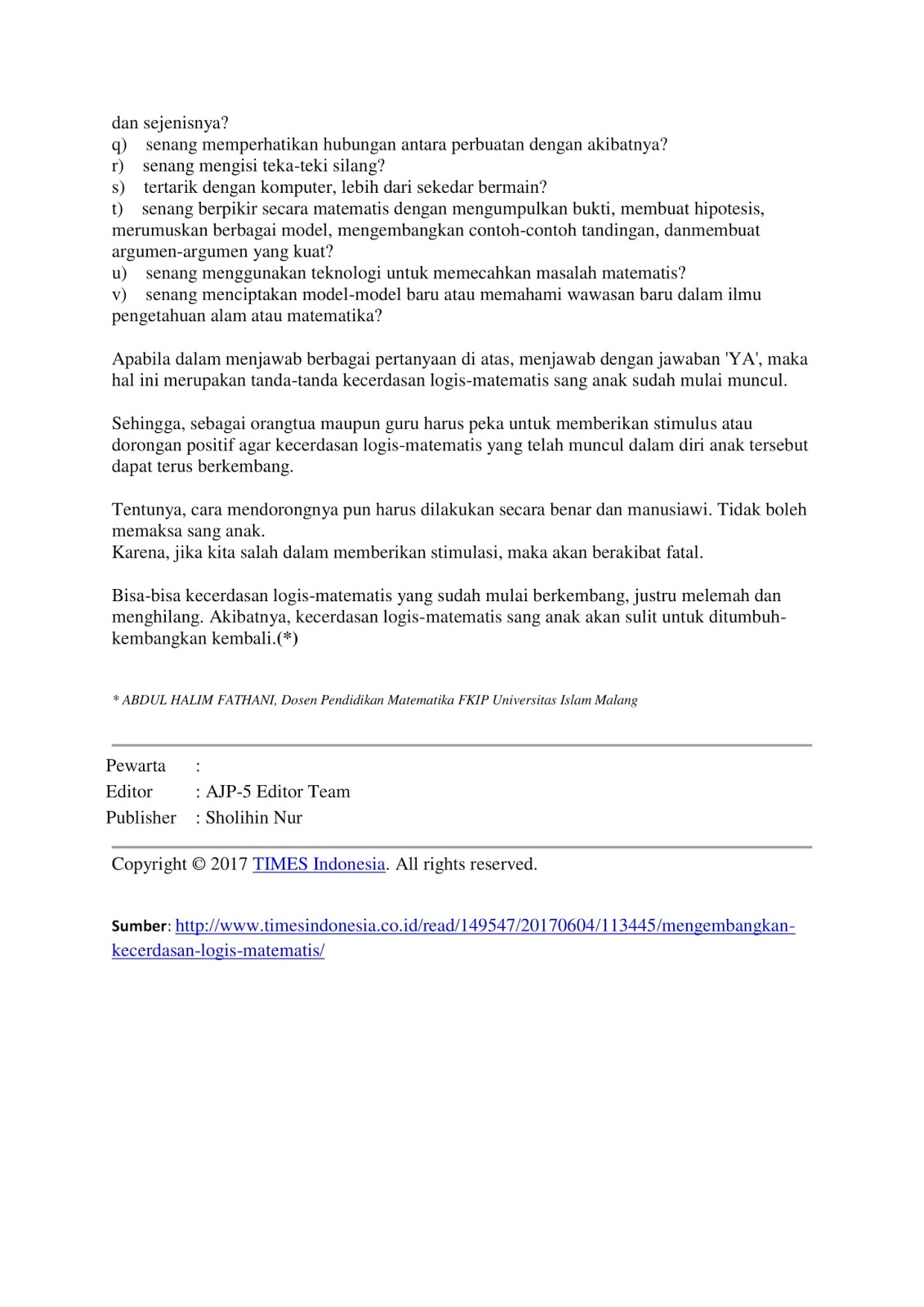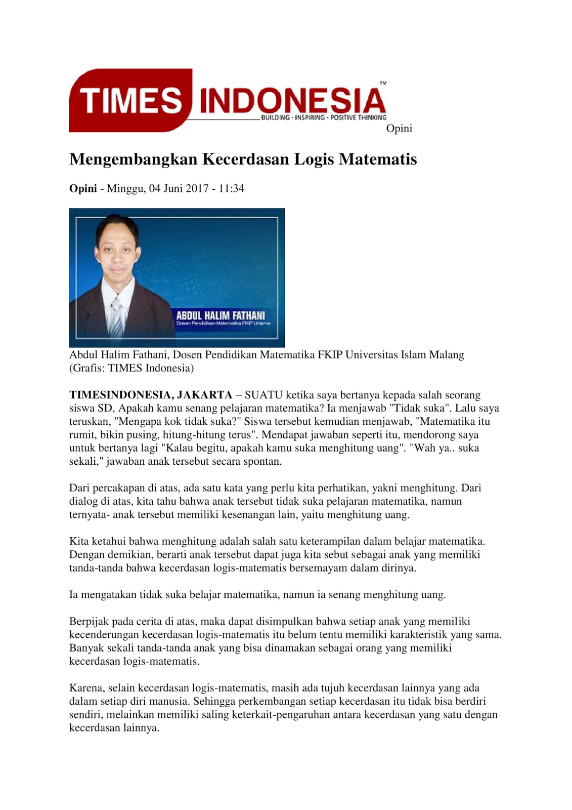 Kecerdasan Logis Matematis Siswa Dalam Menyelesaikan Soal Cerita Berdasarkan Kemampuan Matematika Siswa Kelas Viii Mtsn 2 Tulungagung Institutional Repository Of Iain Tulungagung