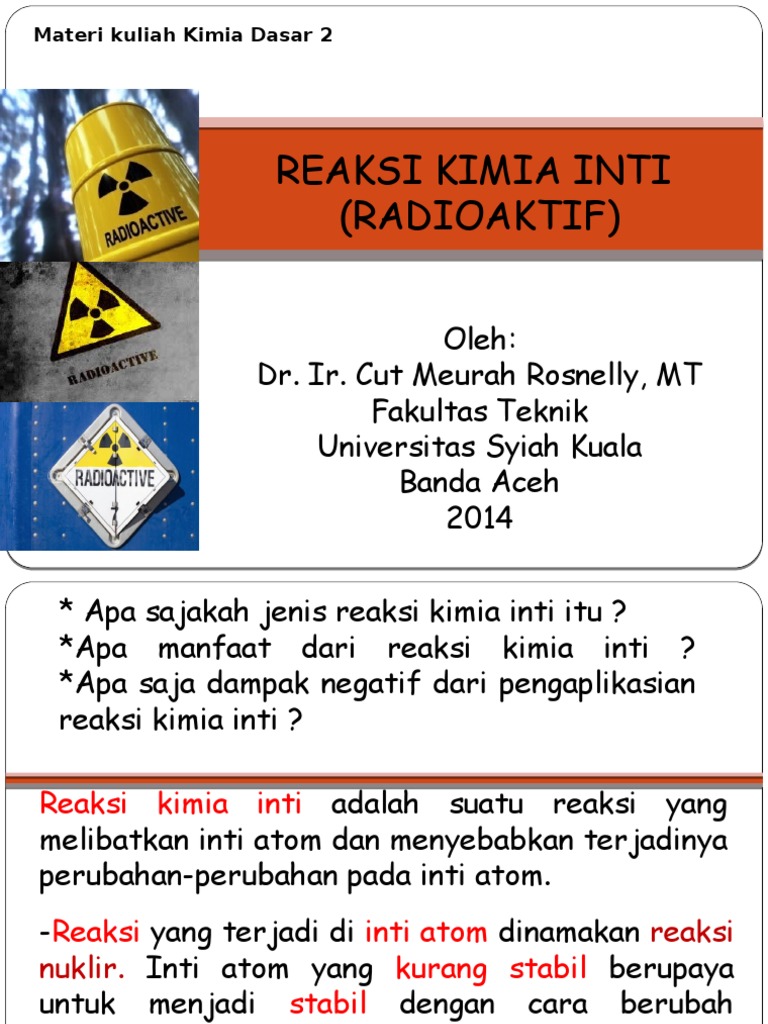 Kimia Inti Dan Radiokimia Budi Budi Inti Persamaan Reaksi Inti Menunjukkan Bagaimana Atom Atom Meluruh Sama Dengan Persamaan Kimia Harus Ada Kesetaraan Massa Dan Muatan Berbeda Pdf Document