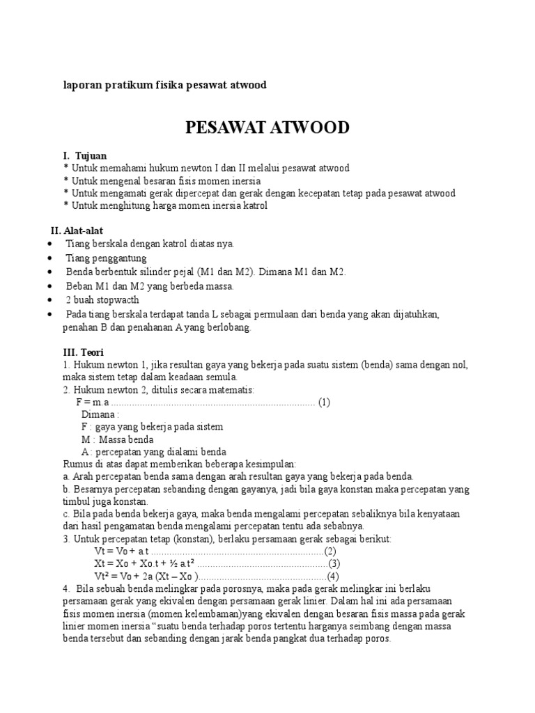 Laporan praktikum pesawat atwood pesawat atwood adalah alat yang digunakan untuk yang menjelaskan hubungan antara tegangan energi pontensial dan energi kinetik dengan menggunakan 2 pemberat massa berbeda dihubungkan dengan tali pada sebuah katrol. Aplikasi glbb terdapat pada penggunaan pesawat atwood yang menganalisis hukum newton baik i ii dan iii. Laporan praktikum fisika dasar pesawat atwood disusun oleh.