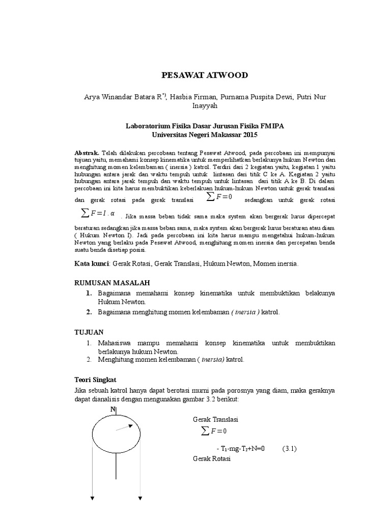 I 0651 12 435 nurul hanifah 0651 12 434 shara deianira 0651 12 449 tanggal praktikum. Wahid taufik m 0651 14 070 tanggal percobaan. Melalui pesawat atwood ini kita dapat mengetahui nilai kecepatan percepatan gaya gesek gravitasi dan momen inersia dari suatu benda.