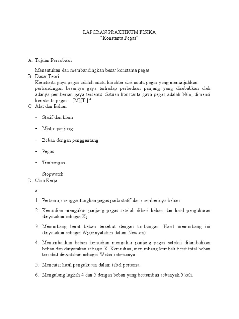Laporan praktikum fisika dasar konstanta pegas. Pendidikan fisika a fakultas. Laporan resmi praktikum akhir fisika dasar 1 tetapan pegas g2 nama. Untuk melaksanakan praktikum.