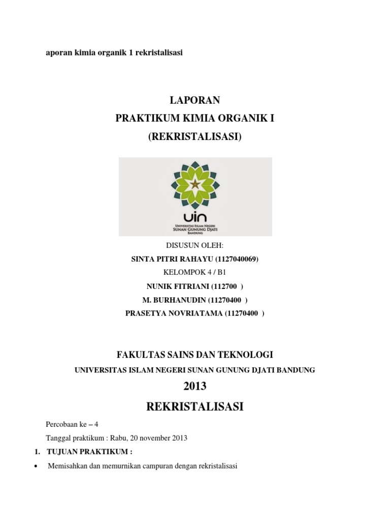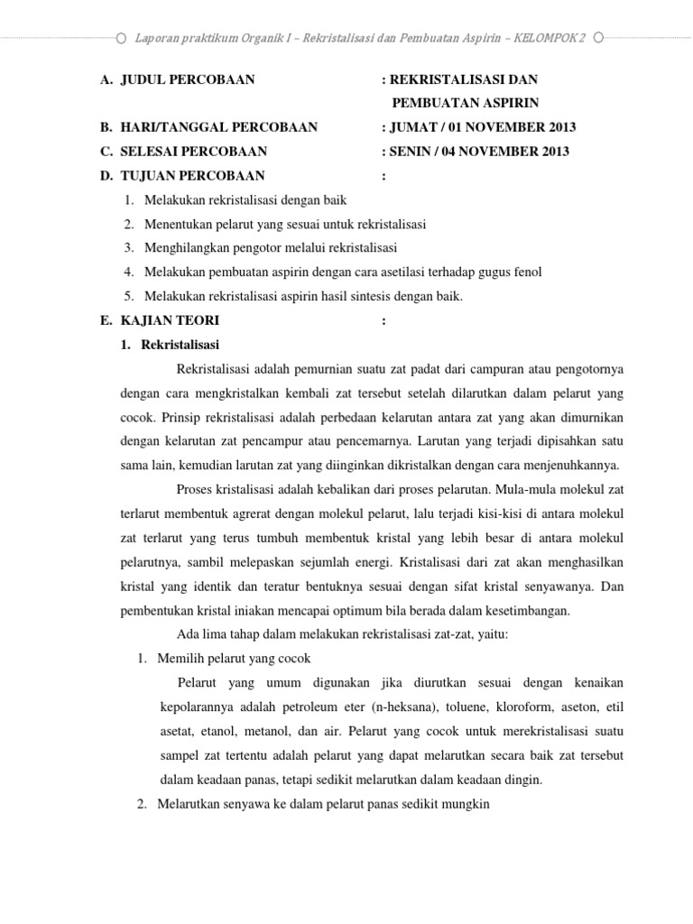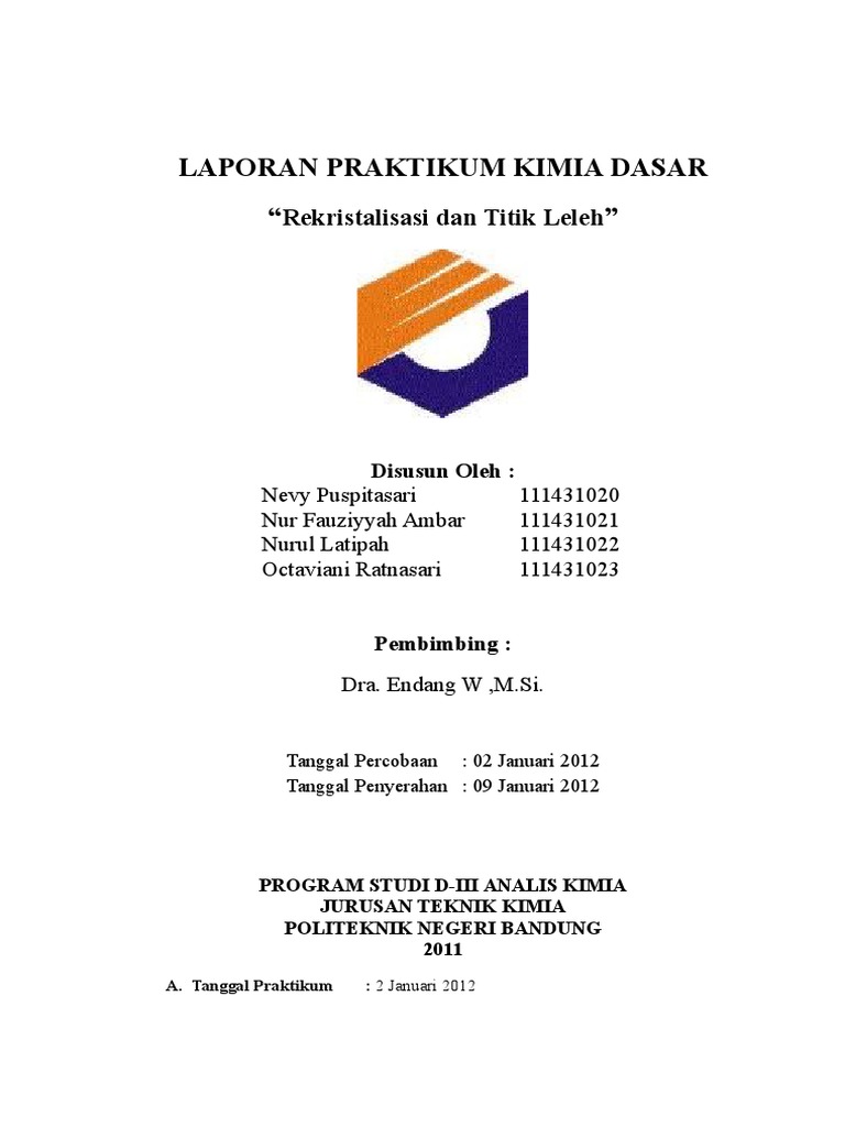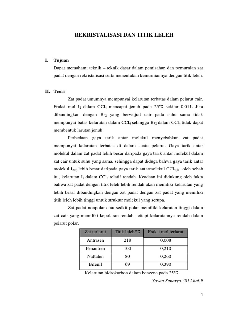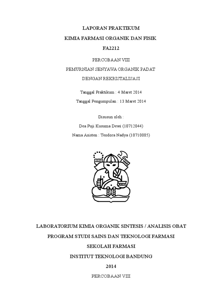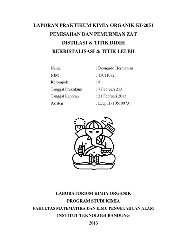 Laporan Praktikum Kimia Organik Percobaan Ix Pemisahan Dan Pemurnian Zat Padat Rekristalisasi Sublimasi Dan Titik Leleh Pdf Free Download