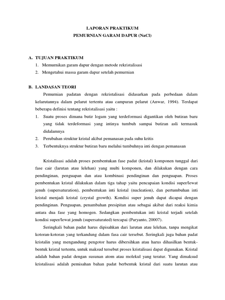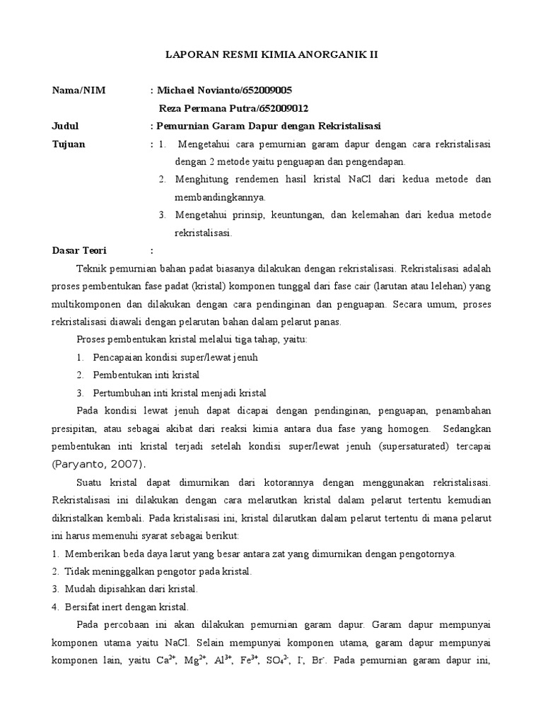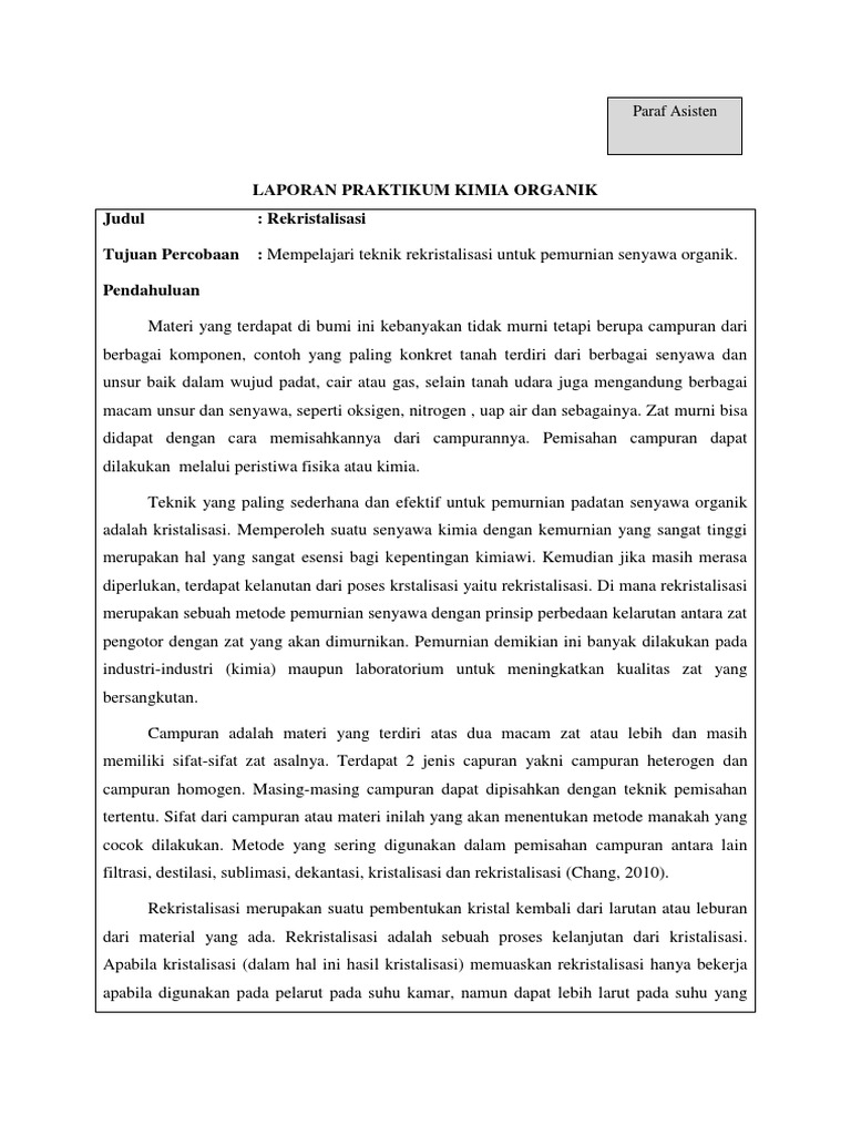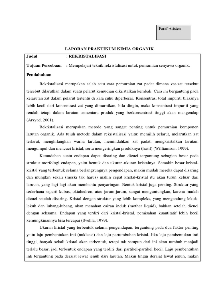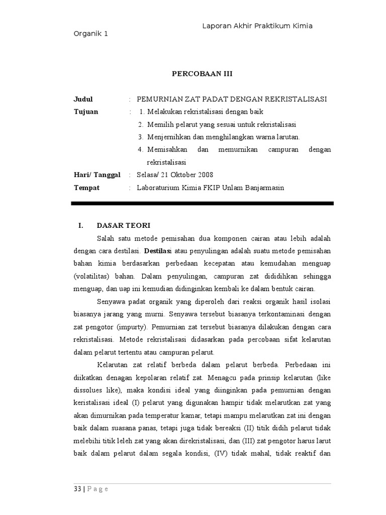 Laporan Praktikum Kimia Organik I Percobaan Viii Pemisahan Dan Pemurnian Zat Padat Rekristalisasi Sublimasi Pdf Download Gratis