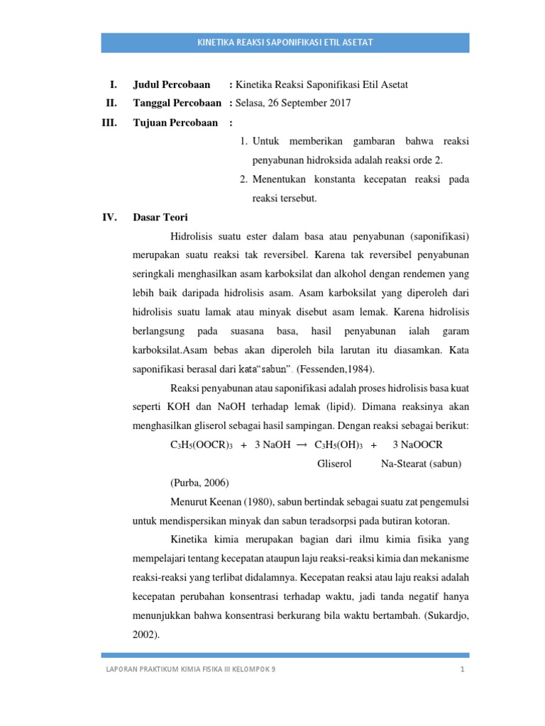 Laporan Praktikum Kimfis Saponifikasi Docx Percobaan 8 Laporan Praktikum Kimia Fisika U201ckinetika Reaksi Saponifikasi Etil Asetat U201d Oleh Kelompok 2 1 Course Hero
