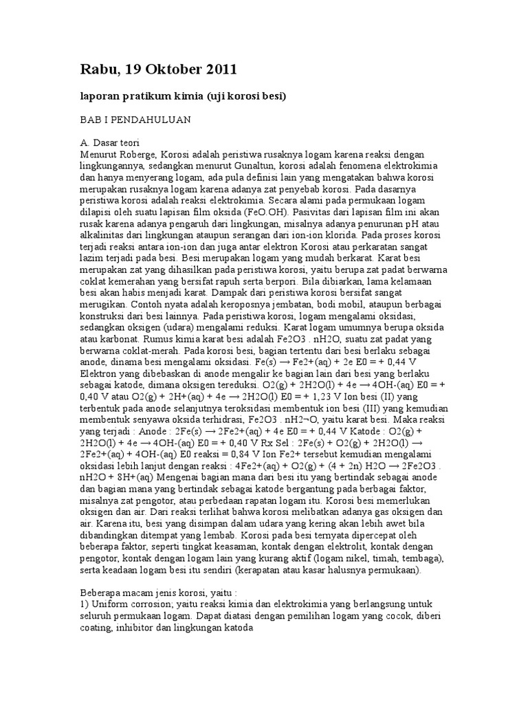 Praktikum Korosi Docx Laporan Praktikum Kimia Uji Korosi Pada Paku Besi Disusun Oleh Kelas Eva Dewi Kencanawati 14 Laely Maftukhah 19 Putri Adi Mega Course Hero