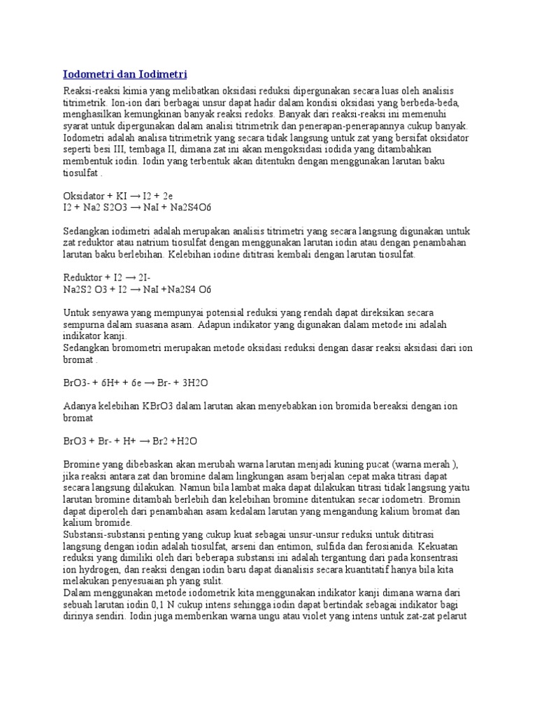 Iodometri Istilah Oksidasi Mengacu Pada Setiap Perubahan Kimia Dimana Terjadi Kenaikan Bilangan Oksidasi Sedangkan Reduksi Digunakan Untuk Setiap Course Hero