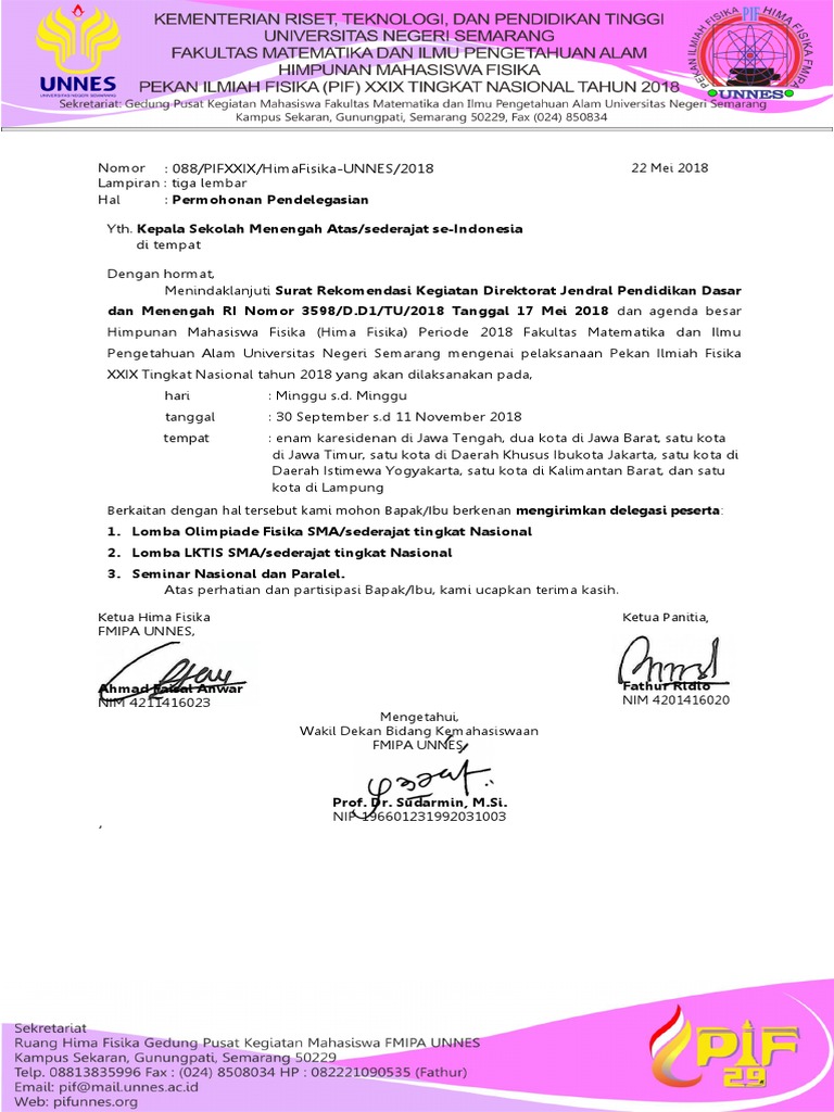 Pekan ilmiah fisika ke 31 tingkat nasional tahun 2020 atau pif xxxi tingkat nasional merupakan agenda besar jurusan fisika fakultas matematika dan ilmu pengetahuan alam universitas negeri semarang yang bertema optimalisasi karya dalam mewujudkan saintis muda menuju generasi bangsa yang hebat dan mandiri.