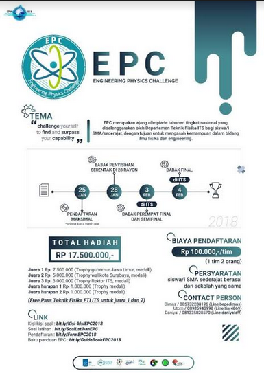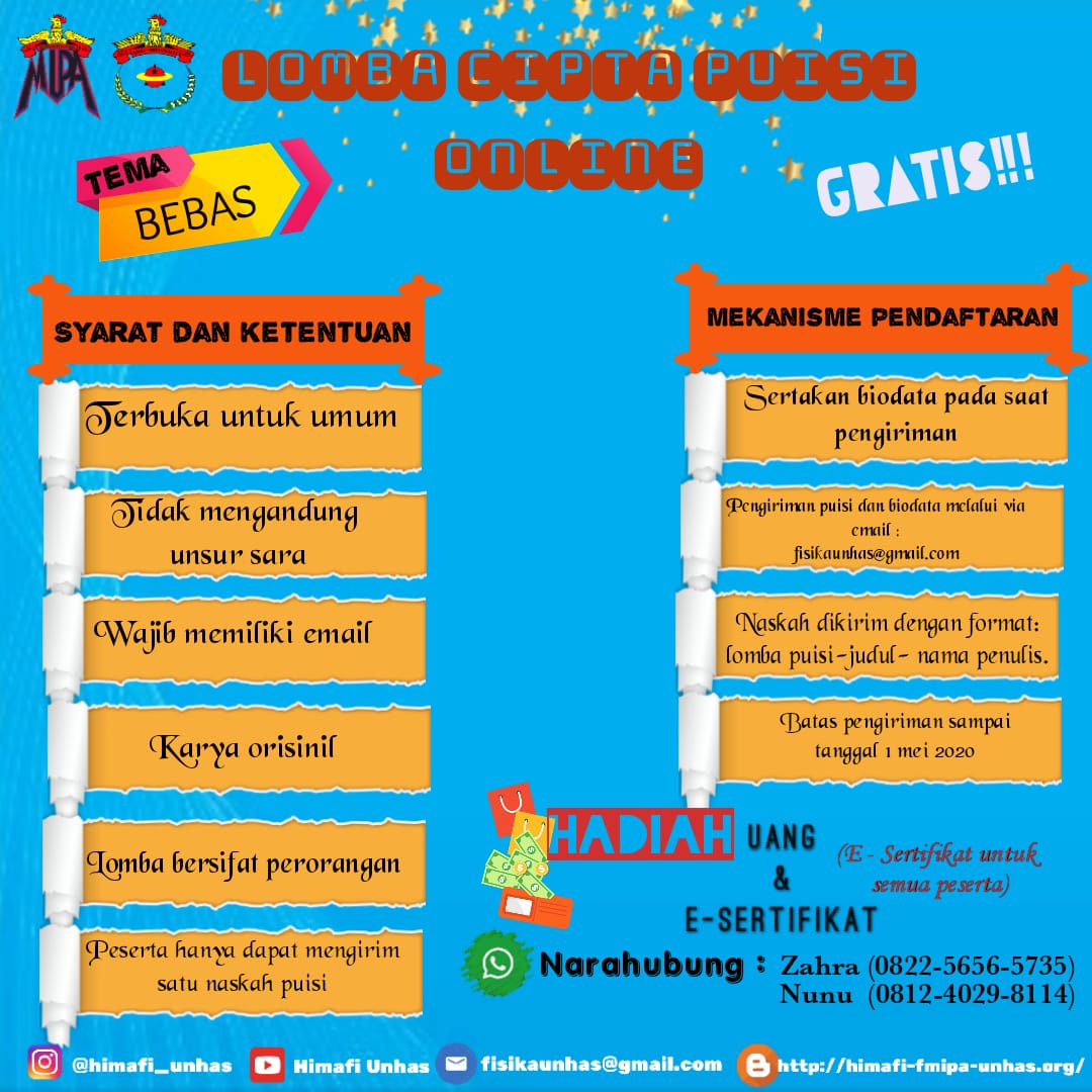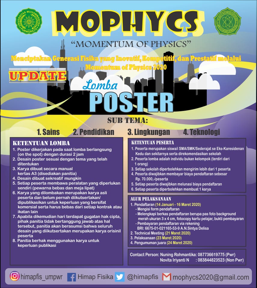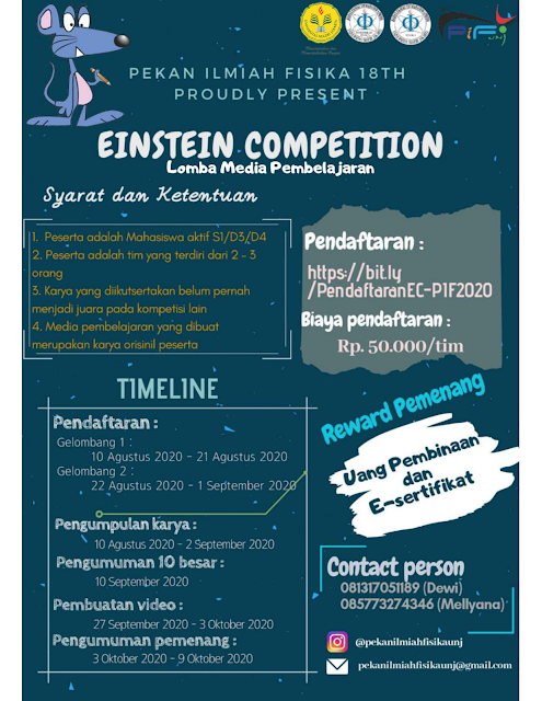 Pekan ilmiah fisika ke 31 tingkat nasional tahun 2020 atau pif xxxi tingkat nasional merupakan agenda besar jurusan fisika fakultas matematika dan ilmu pengetahuan alam universitas negeri semarang yang bertema optimalisasi karya dalam mewujudkan saintis muda menuju generasi bangsa yang hebat dan mandiri. Daftar lomba 2020 event lomba 2020 kontes 2020 lomba berhadiah 2020 ada ratusan lomba atau bahkan ribuan lomba dari berbagai macam dan jenis yang bisa kamu ikuti di tahun 2020.