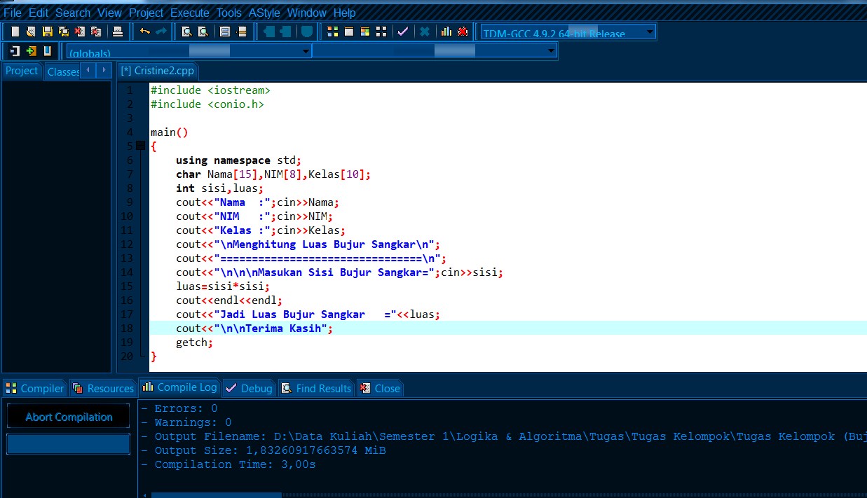 S 8 cm. Kali ini saya akan membagikan tutorial bagaimana cara membuat sebuat program penghitung luas lingkaran persegi panjang dan bujur sangkar. Yang perlu anda butuhkan adalah compiler borland c 502.