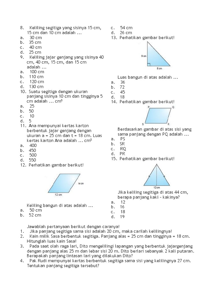Berikut ini adalah penjelasan lebih lengkap disertai dengan contoh soal. Luas trapesium 7 23 8 2 120 cm 2. Luas dan keliling bangun di atas adalah.