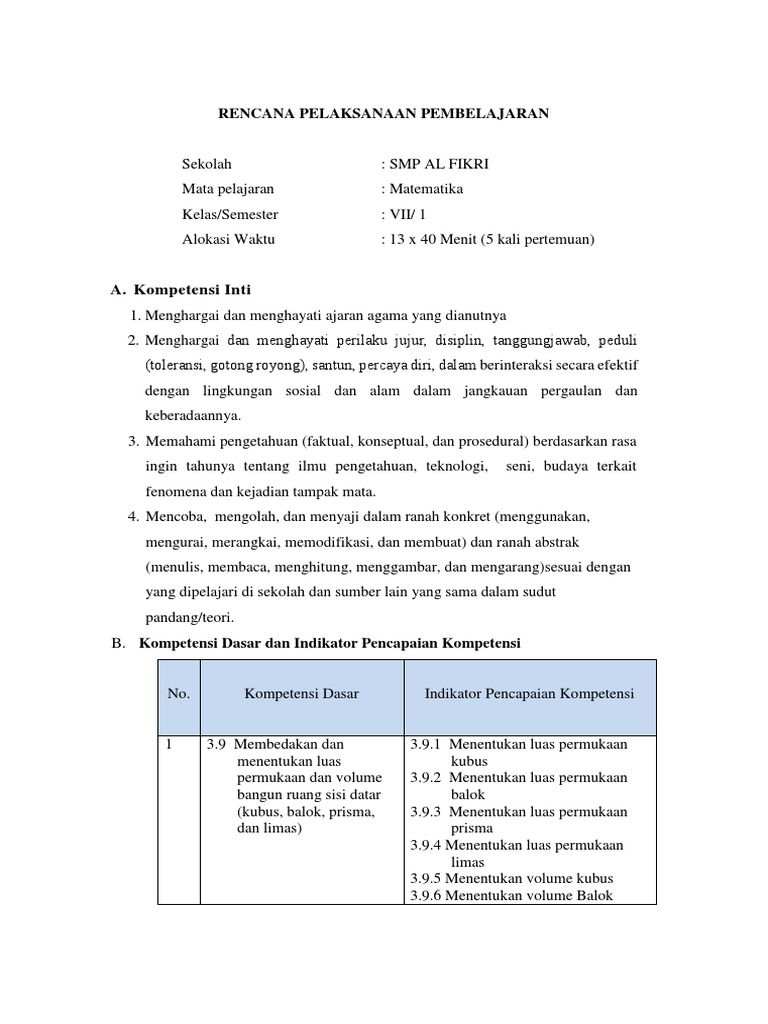 Rpp Kd 3 9 Full Docx Rencana Pelaksanaan Pembelajaran Rpp Sekolah Mata Pelajaran Kelas Semester Materi Pokok Alokasi Waktu Smp Mts Matematika Viii Course Hero