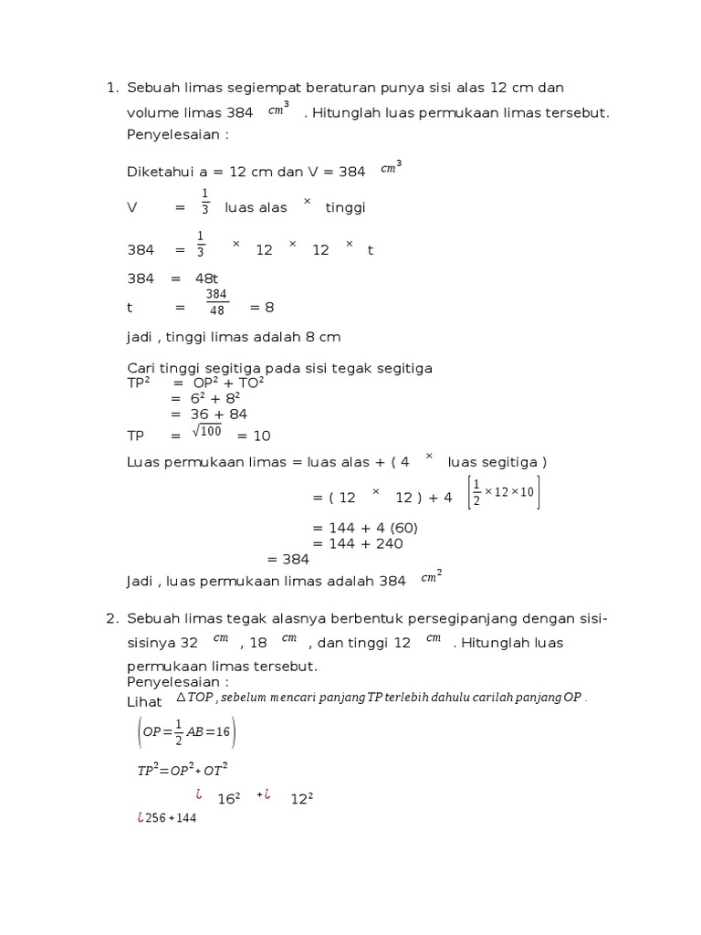 Hitunglah luas permukaan limas. Diketahui luas salah satu segitiga itu 135 cm 2 dan tinggi segitiga dari puncak limas 15 cm. L s x s 4 x 12 x s x t.