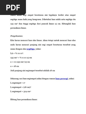 Luas permukaan limas segi empat beraturan. Luas permukaan limas segi empat adalah suatu bangun ruang yang dibatasi oleh alas yang berbentuk segiempat dan sisi sisi tegak berbentuk segitiga. Rumus volume limas segi empat dan luas permukaan limas segi empat limas segiempat merupakan salah satu bangun ruang 3 dimensi yang mempunyai lima sisi dengan alasnya yang berbentuk segi empat dan sisi tegaknya berbentuk segitiga. Rumus dasar untuk luas permukaan limas apa pun baik beraturan maupun tidak.