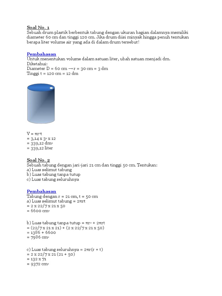 L p r 2. Tabung adalah sebuah bangun ruang tiga dimensi yang memiliki tutup dan alas yang berbentuk sebuah lingkaran dengan ukuran yang sama dengan di selimuti oleh persegi panjang. Demikianlah beberapa soal soal tabung dan pembahasannya.